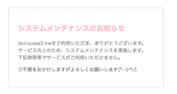 メンテナンスページつくったの。 適当なサイトの例をコピペして 色とか文とかいじってみた。 Hpをつくっていて 構造ガン無視し過ぎてfooterが一番上にきてしまっている図です。 動画のチュートリアルを粛々と観ていたのだけれども 「自分のつくりたいようにつくりたーい」 って自分でデザインしたらこのザマです。 最終的な解決法 footer要素も全て突っ込む。 GitHubのほうは明日反映させる〜