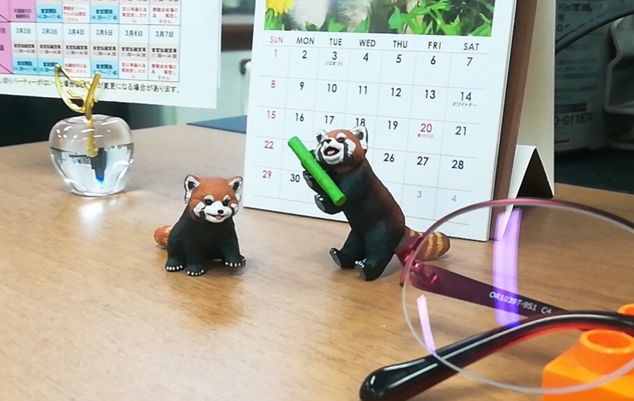 職場のデスクにいるレッサーパンダ